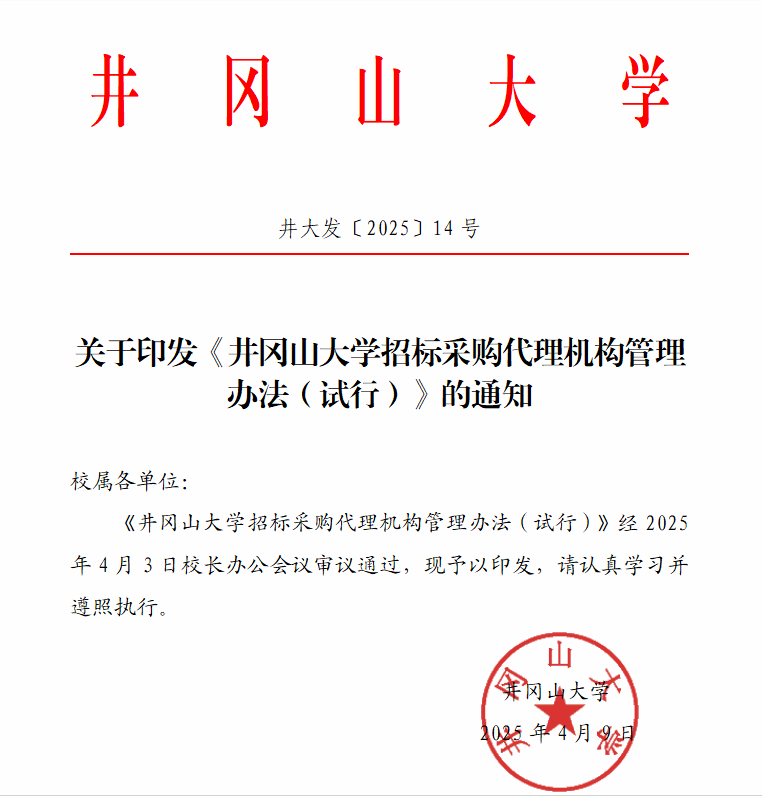 《井冈山大学招标采购代理机构管理办法(试行)》(井大发〔2025〕14号)